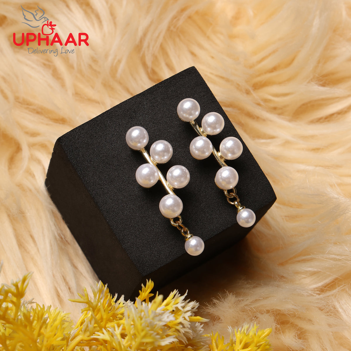 Discover the perfect accessory for every mood and occasion with the UPHAAR Signature Collection. This thoughtfully curated pair of premium earrings features a sophisticated multi-pearl design for added movement and shine. Each pair is crafted with fine attention to detail, featuring a sleek golden vertical bar anchored with six radiant white pearls in an elegant, staggered arrangement. A single delicate pearl dangles from the base, making this pair both eye-catching and timeless.